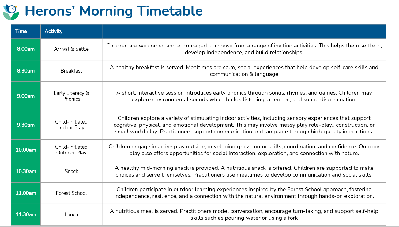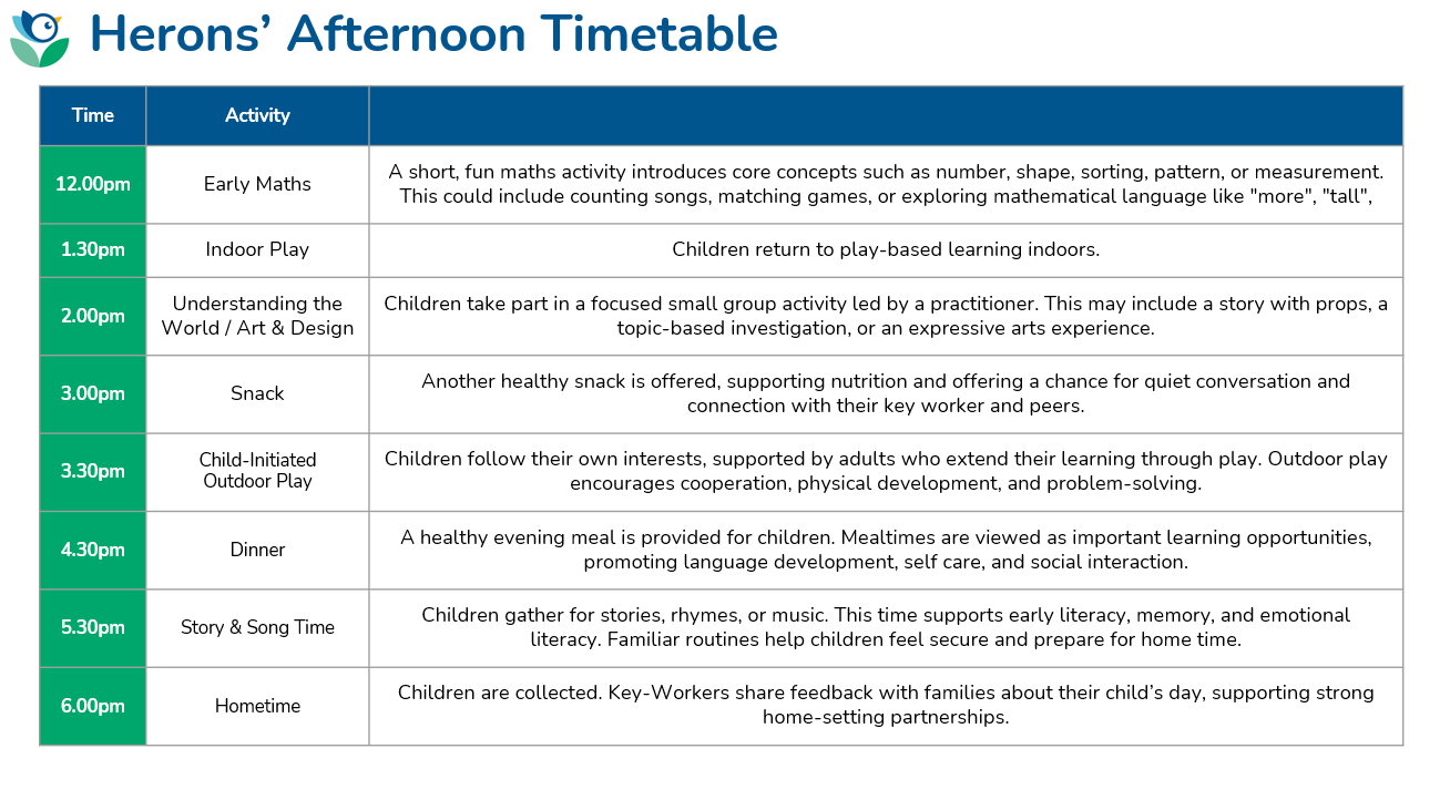 Our Herons room prepares children for their next steps in learning through purposeful play and enriched experiences. We follow the Early Years Foundation Stage (EYFS) curriculum, offering carefully planned activities across all seven areas of learning: Personal, Social and Emotional Development, Communication and Language, Physical Development, Mathematics, Literacy, Understanding the World, and Expressive Arts and Design.